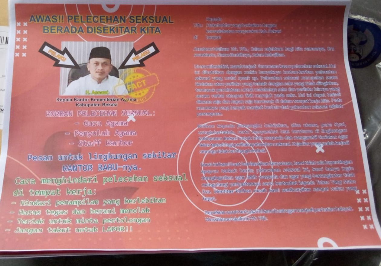 Dalam Pamplet yang beredar itu, tertulis narasi “AWAS PELECEHAN SEKSUAL DI SEKITAR KITA” hal tersebut menunjukan sebuah photo yang diduga adalah kepala kemenag kabupaten Bekasi.