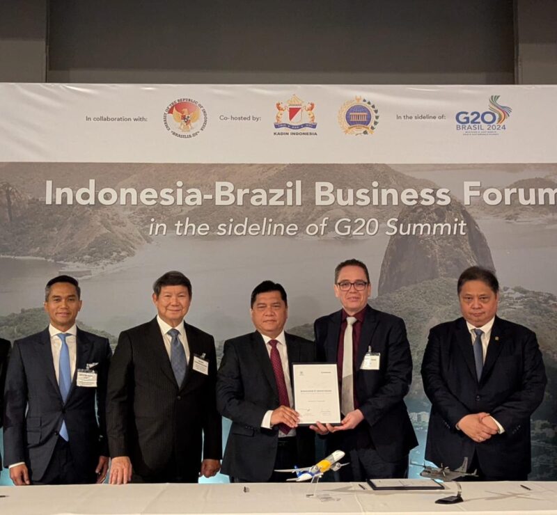 RIO DE JANEIRO, BRAZIL –Embraer dan PT Dirgantara Indonesia (PTDI), perusahaan kedirgantaraan terkemuka di Indonesia, telah menandatangani Nota Kesepahaman (MoU) untuk memperluas kolaborasi dalam industri penerbangan komersial. MoU ini ditandatangani dalam Forum CEO Indonesia-Brasil yang dipimpin oleh Presiden Indonesia Prabowo Subianto, di sela-sela KTT G20 di Brasil, dengan disaksikan oleh beberapa tokoh penting Indonesia, termasuk Menteri Koordinator Bidang Perekonomian RI Airlangga Hartarto, Utusan Khusus Presiden RI Hashim Djojohadikusumo dan Ketua Kamar Dagang & Industri Indonesia (KADIN) Anindya Bakrie.