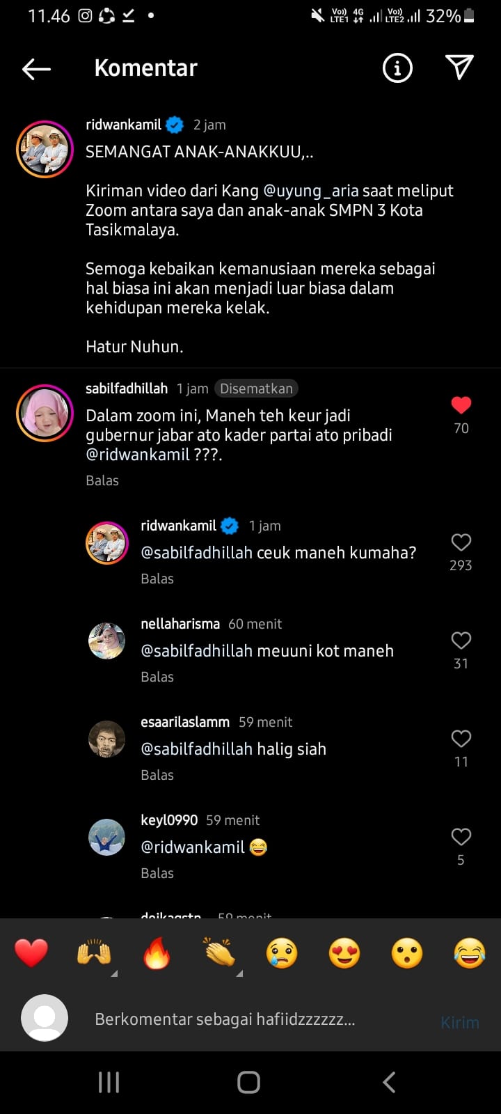 “Dalam zoom ini, maneh teh keur jadi gubernur jabar ato kader partai ato pribadi @ridwankamil???? (“Dalam zoom ini, kamu lagi jadi gubernur atau kader partai atau pribadi)” komentar Sabil dikutip dari kolom komentar instagram Ridwan Kamil, Rabu (15/03/2023).